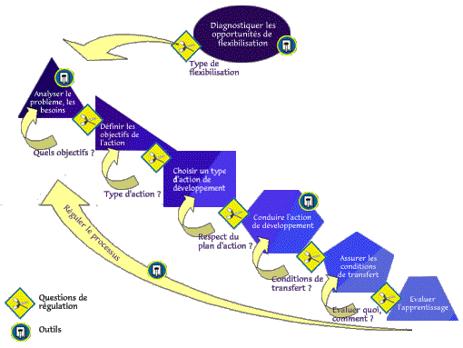 Le projet ADAPT Flexifor a débouché sur la mise au point d'une méthodologie de flexibilisation de la formation structurée en 7 étapes illustrées par le schéma ci-dessous. Une réflexion a été menée sur les concept de formation, de flexibilisation, de co-pilotage, Des outils spécifiques d'accompagnement sont proposés pour certaines des étapes. La Visite Guidée vous donnera une compréhension globale de la méthodologie . Le bouton Concepts, Méthodes et Outils vous donnera accès aux outils et au cadre conceptuel du projet.
