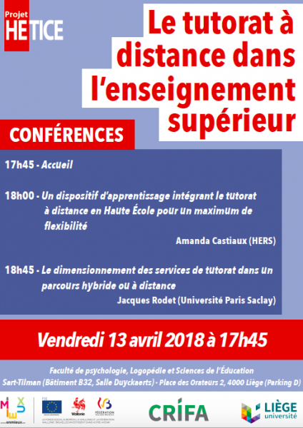 Dans le cadre du projet HETICE, une soirée de conférences riches en apprentissages et en échanges sur le thème du Tutorat à distance dans l’enseignement supérieur s'est déroulée à l'Université de Liège ce vendredi 13 avril.