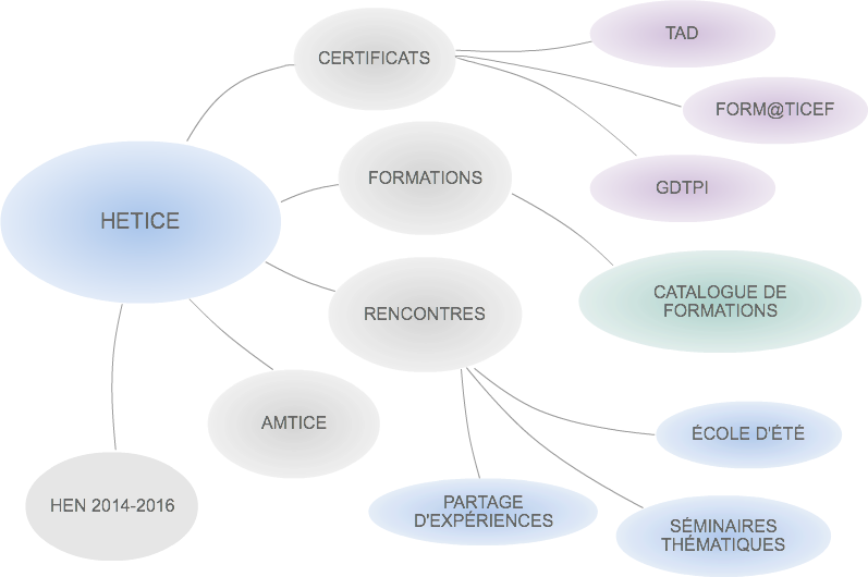 HETICE propose plusieurs types d'actions aux enseignants de Hautes Écoles. Pour les découvrir, nous vous invitons à consulter la carte mentale ci-dessous, en cliquant directement sur la rubrique de votre choix. Par ailleurs, vous pouvez suivre l'agenda des activités et diverses nouvelles en vous référant aux rubriques situées à droite de la présente page.